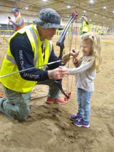 As the night went on we realized that this was going to be a little different from our usual camp set ups. Because there was this awesome outdoors show going on in the main arena and families were coming and going, we really had to stay flexible with our plans and how we did our Kicking Bear stuff. Normally we get that big group at the start of a camp and then spend a lot of time hanging out with them before we end camp with the big Gospel message and celebration. This was different. Families would come in and shoot with us, then maybe go walk around a bit, many would come back. It left us scratching our heads a little as we really weren’t able to capture that big group and move them through our planned activities. I mean as we turned the lights off Friday night I realized I hadn’t chucked a single marshmallow, the girls hadn’t beat the boys in tug of war, and what really had us rattled was that we didn’t have that big Gospel sharing moment. If we would have judged everything off our man made plans, it really looked like we were maybe failing here. But……with God, anything is possible!