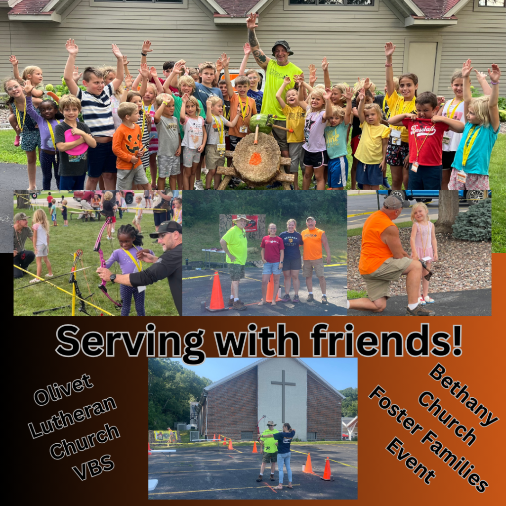 August was a great month for us because we had many opportunities to serve with our friends!  We kicked off the month by helping our friends at Olivet Lutheran Church wrap up their vacation bible school week with a fun Kicking Bear night!  The highlight of the night was definitely throwing tomahawks at watermelons, fun!!